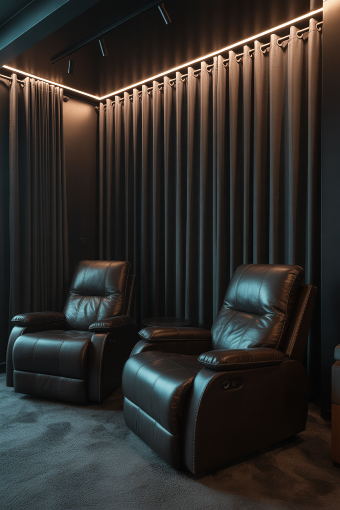 Blackout curtains instantly turn an ordinary space into a true viewing environment. By eliminating outside brightness, they allow the screen to become the main visual focus. Colors appear deeper, contrast improves, and details become sharper. This small change dramatically improves immersion and comfort. Among Theatre Room Ideas, blackout curtains are one of the most effective upgrades because they deliver immediate visual impact without construction or complex installation. They also help reduce outside distractions, making the room feel calm, enclosed, and designed specifically for entertainment rather than general living.