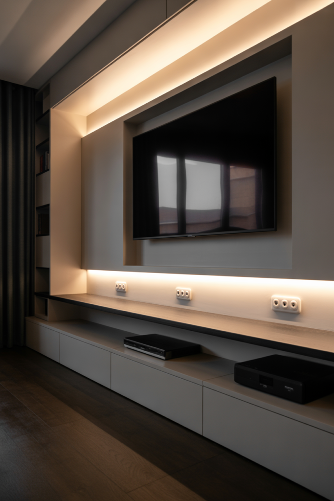 Backlighting enhances contrast while keeping the space calm and elegant. It makes the room feel warmer and more immersive. Over time, this gentle illumination becomes a signature feature that elevates the entire design without overpowering the viewing experience.