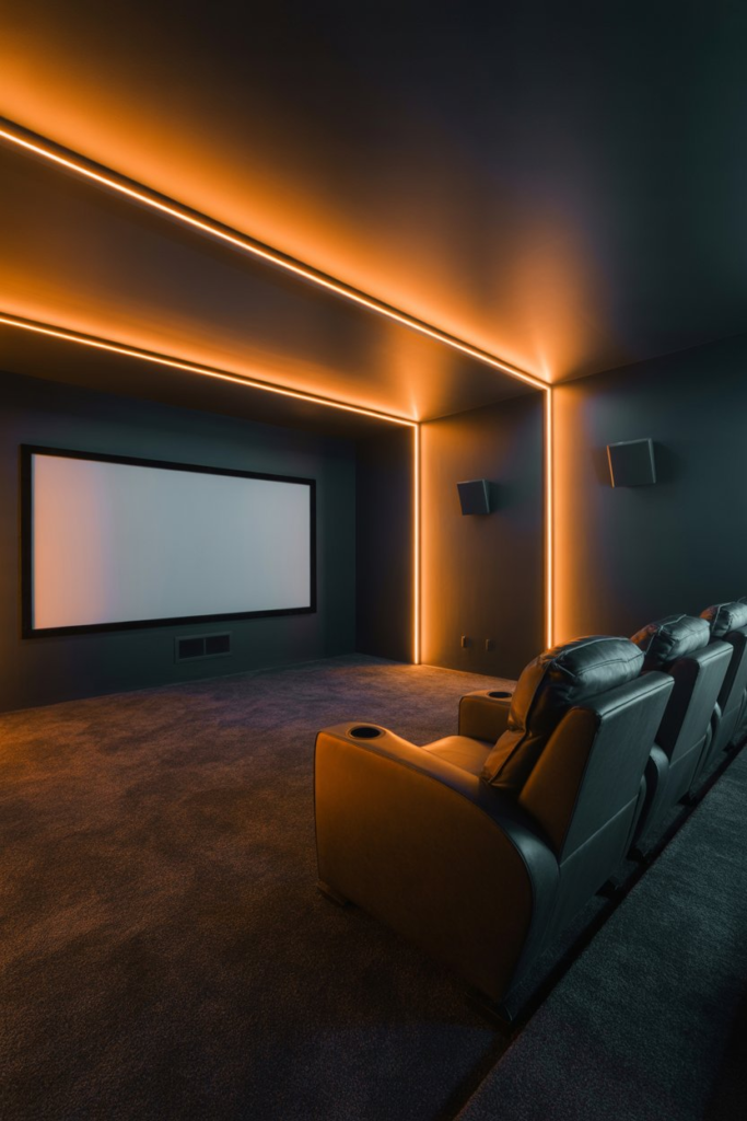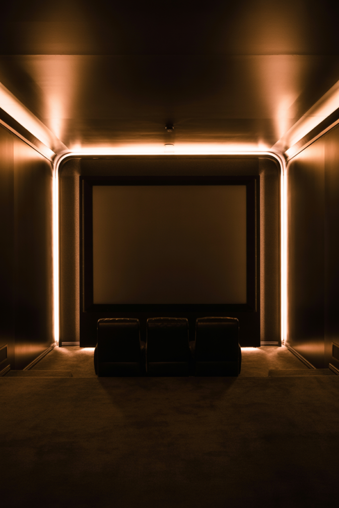 Cove lighting visually lifts the ceiling and adds architectural polish without clutter. The room feels larger, cleaner, and more refined. Because the light is indirect, it supports the viewing experience instead of competing with it. Over time, this lighting becomes one of the most visually powerful features of the space.