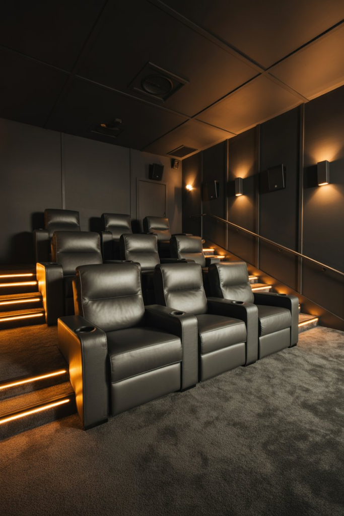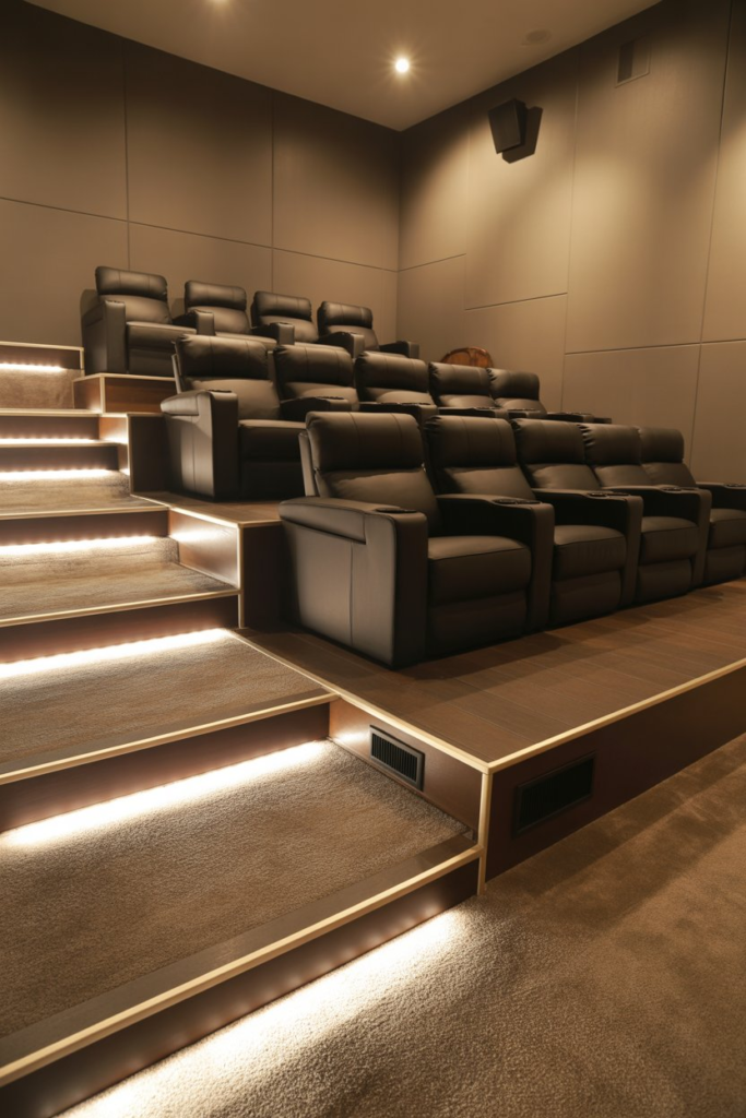 The layered layout brings order and balance while making the room feel like a real cinema. Each row feels defined, which helps organize guests and improve comfort. Soft lighting along the steps increases safety and adds visual depth without distraction. Over time, this arrangement makes the space feel more luxurious and immersive, even if the room itself is small.