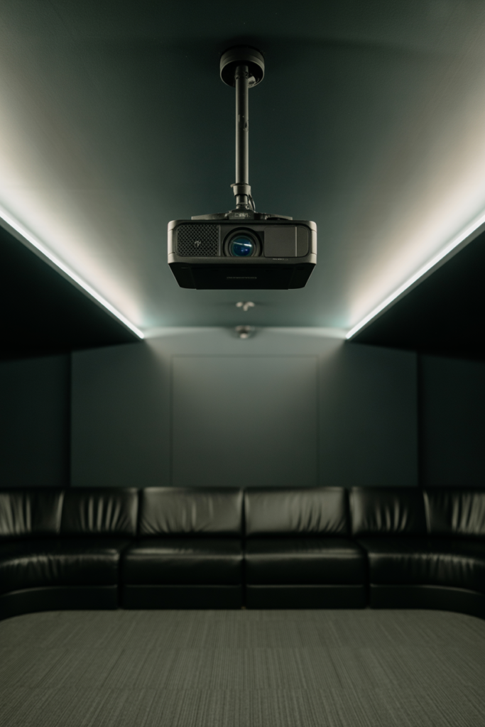 A mounted projector makes the room feel engineered rather than improvised. It aligns with professional theater design and enhances visual balance. Over time, this setup reduces maintenance and keeps the layout visually calm. The space feels polished, modern, and intentionally built for entertainment.