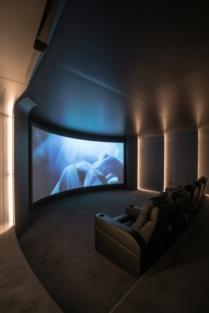 A curved screen adds visual drama and a futuristic edge to the room. It becomes a powerful focal point that defines the entire layout. Over time, the space feels more engaging and immersive, turning every viewing session into a premium experience. The room gains a distinctive look that feels custom-designed rather than standard.